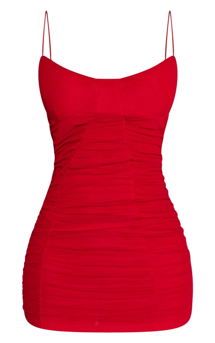Be the ultimate show-stopper in this figure-hugging dress. Featuring a red mesh material with cup detailing and an extreme ruched design, we’re so obsessed. Simply style with clear heels for an unforgettable finish.