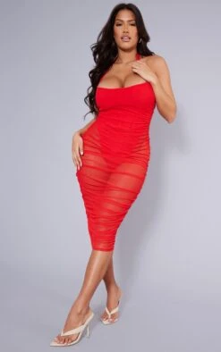 Get ready to make a statement with this shape red mesh ruched halterneck bodycon dress. Brought to you in a red mesh material with ruched detailing and a halterneck design. This women’s bodycon dress will compliment your curves in all the right places. Simply hair with your white toe-thong heels and accessories for a glam finish.