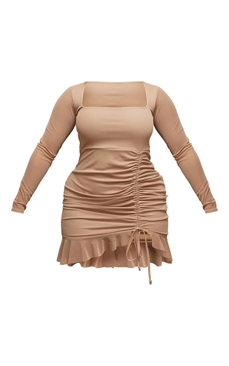Add some neutral tones into your weekend wardrobe with this shape taupe mesh long sleeve ruched side frill hem bodycon dress. Brought to you in a taupe mesh material with long sleeves, a ruched side and a frill hem, we can’t get enough. This versatile dress is perfect for your new season wardrobe doll. Style with clear high heels and statement accessories for a look that we can’t stop crushing on.