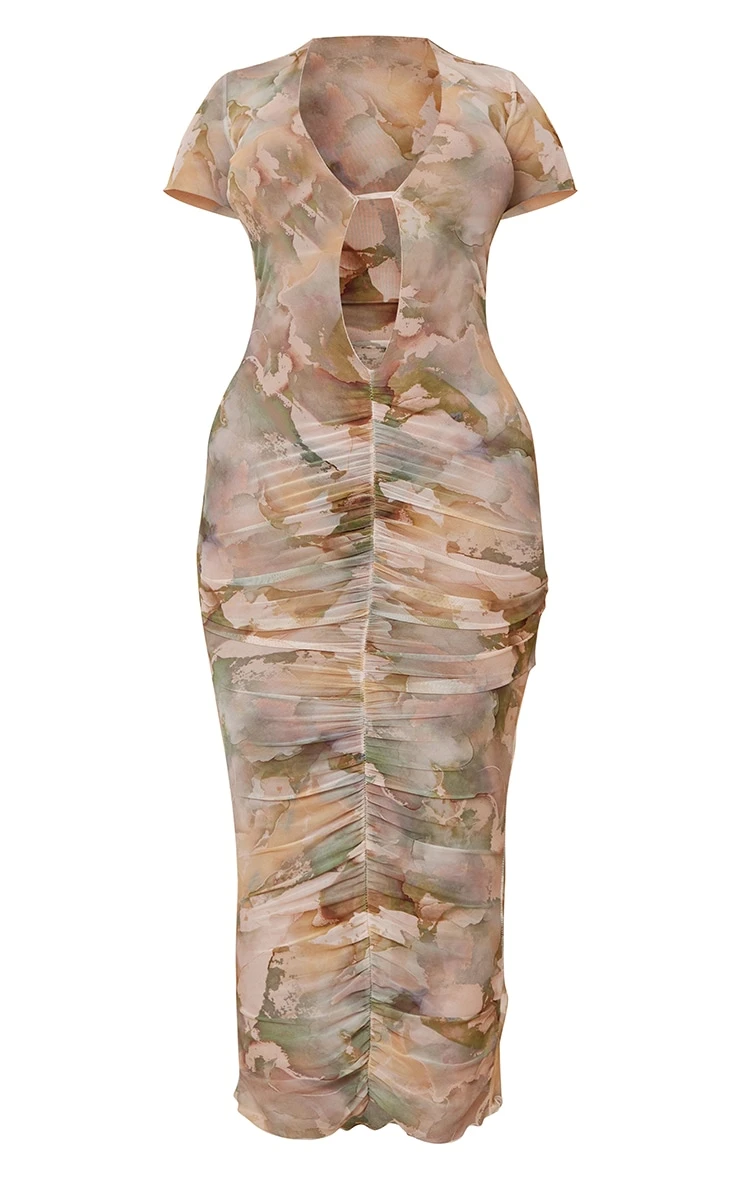 Get ready to have all eyes on you in this figure-flattering dress. Featuring a watercolour print sheer mesh material with a plunging neckline, ruched detailing and a midaxi length. Just add heels and accessories for a look we just can’t get enough of.