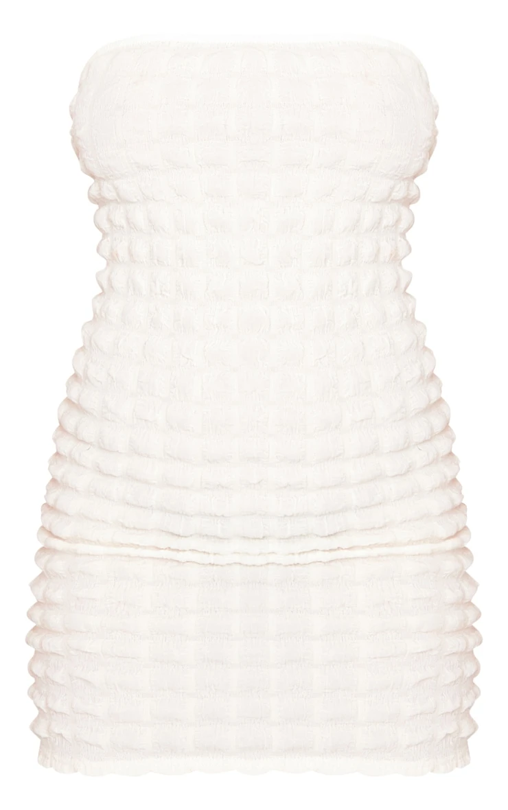 Hit refresh on your weekend wardrobe with this dress. Featuring a white textured material with a bandeau neckline and a figure-hugging fit. Style with slip-on heels and a mini bag for a date with the dolls.