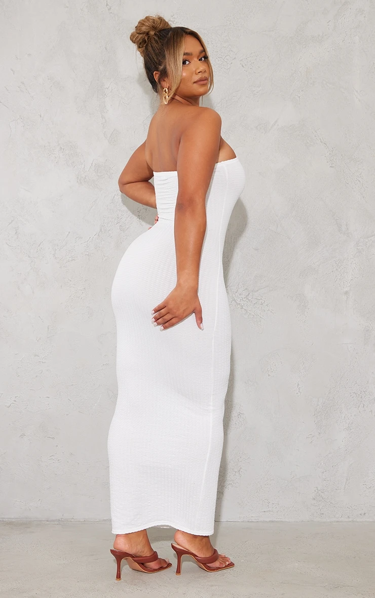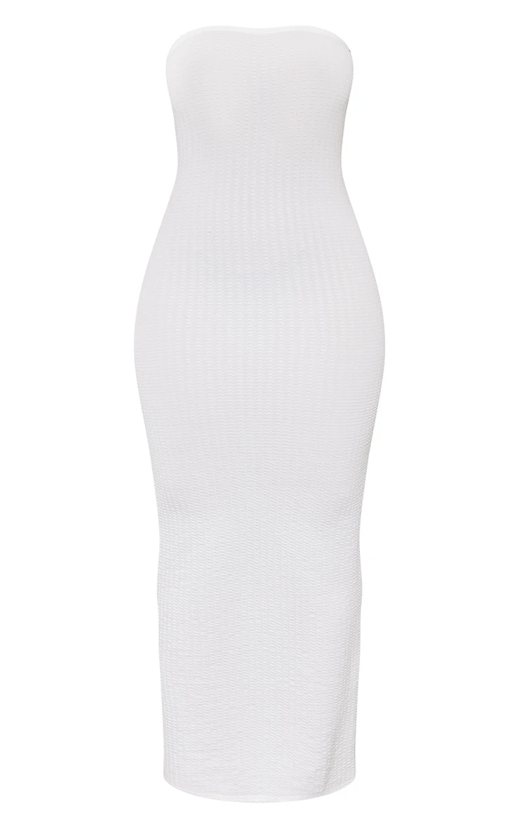Add some freshness to your weekend look with this dress. Featuring a white textured material with a bandeau neckline and a midaxi length, we are in love. Style with a shoulder bag and heeled mules to keep all eyes on you.