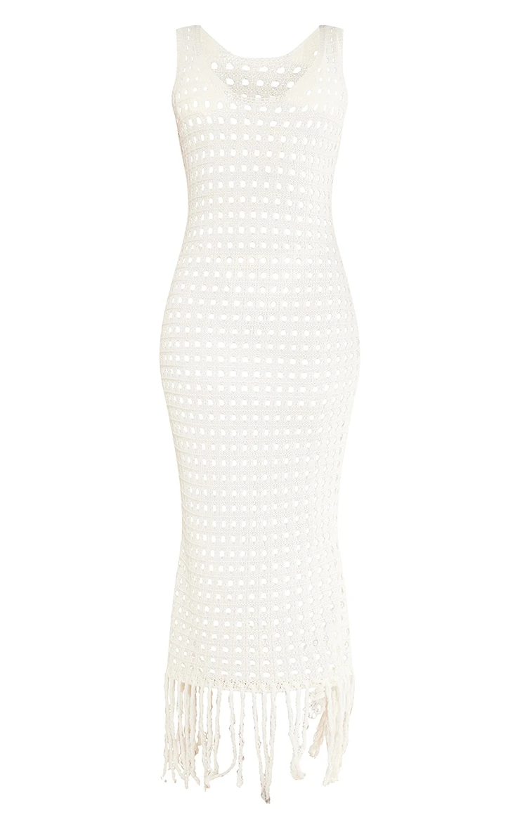 Give your look a chic finish with this dress doll. Featuring a cream crochet material with tassel detailing and a maxi length. Style this with your fave bikini and slides to complete the look.